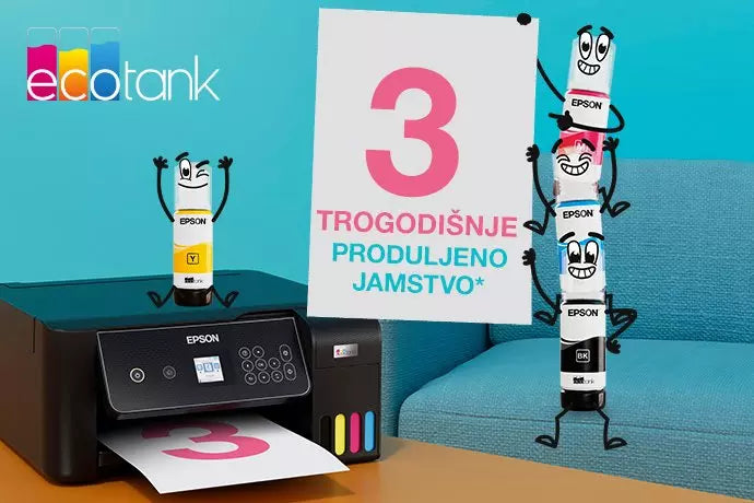 Svi Epson pisači dolaze s osnovnim jamstvom od 12 mjeseci, a uz besplatnu online registraciju, ostvaruješ dodatnih 24 mjeseca produženog jamstva – ukupno 3 godine bezbrižnog korištenja.